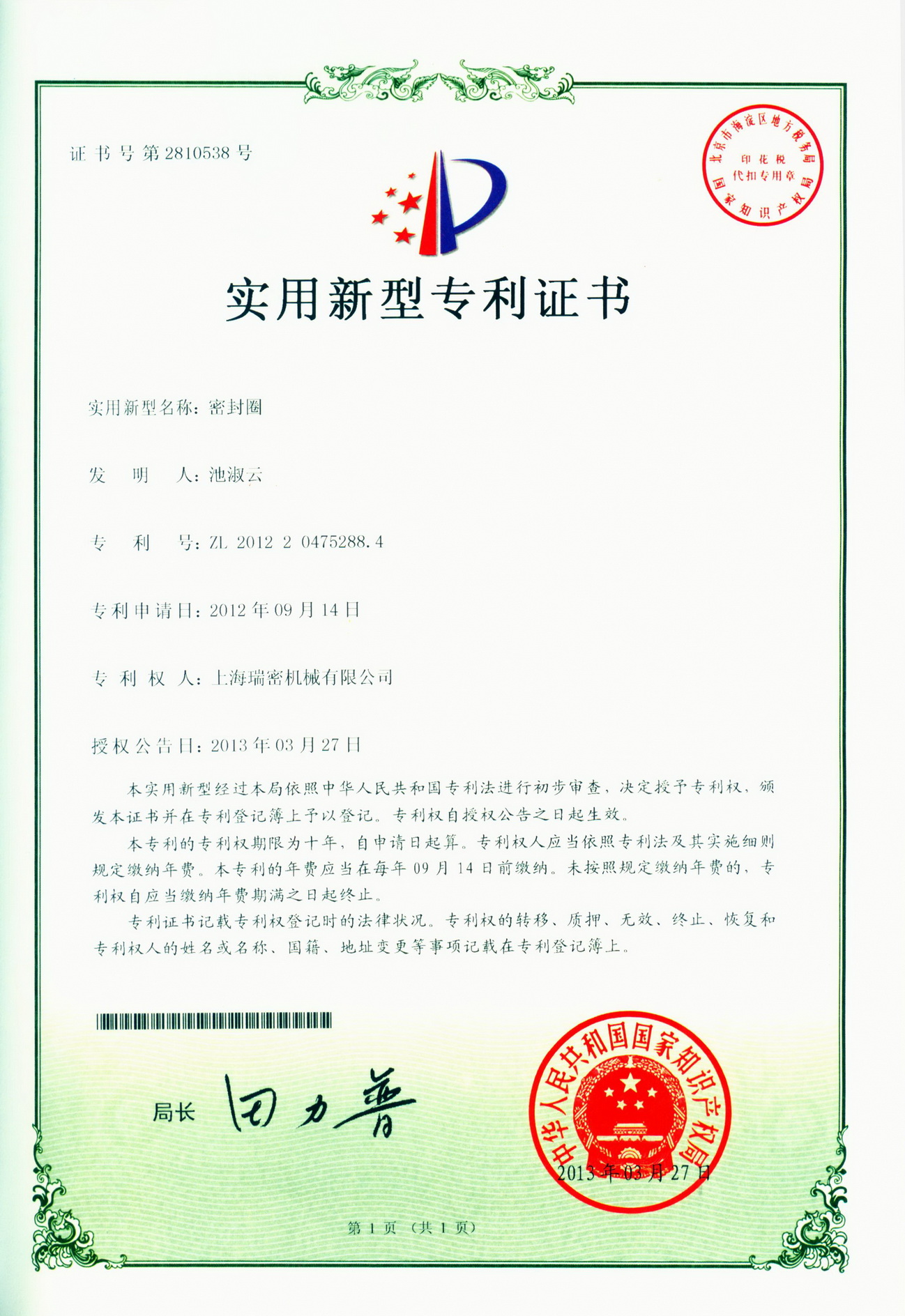 我公司荣获国家密封圈实用新型专利 专利号:ZL 2012 2 0475288.4