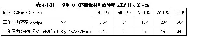 在橡胶材料标准中,以硬度和压缩永久变形两项性能最为主重。选择压缩变形较小的橡胶材料对密封性能是有利的,而硬度对于O形橡胶密封圈耐压和抗挤又是至关重要的。根据国内标准和实践经验,橡胶在规定温度下的压缩永久变形最大不超过50%。而橡胶的硬度与密封工作压力密切相关,压力越高,硬度也是越高;参见表4-1-11