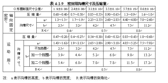 固定密封用O形橡胶密封圈的压缩率,一般情况下选用15~25%(此数据经验数据),运动密封如往复运动情况下压缩率选用10~12%,旋转运动下一般取3~5%的压缩率,常用O形橡胶密封圈压缩量与沟槽尺寸见表4-1-9